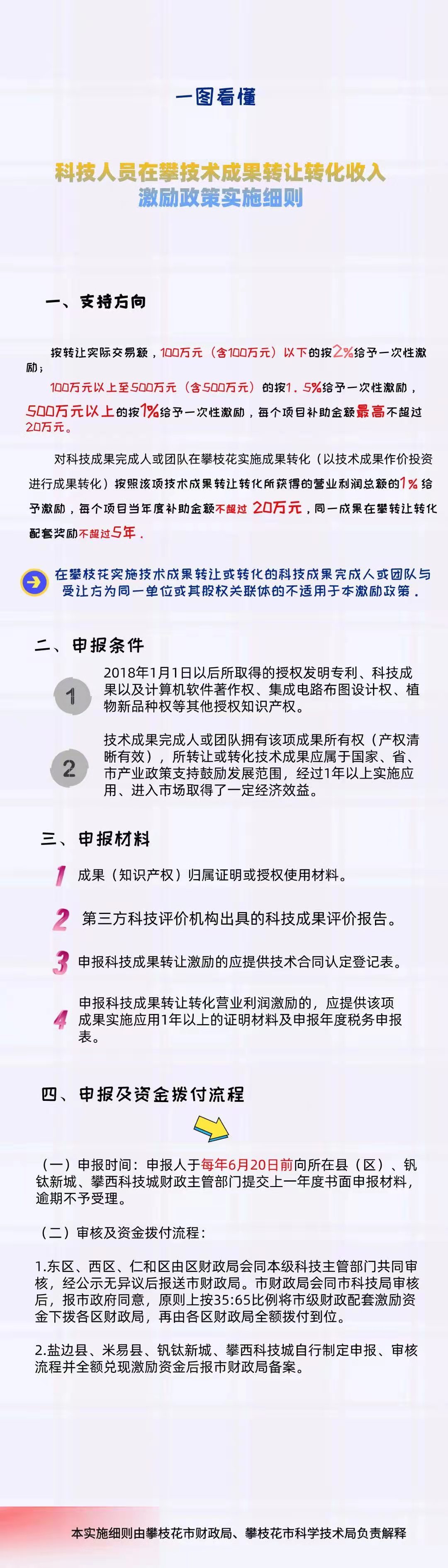 为贯彻落实中共攀枝花市委办公室、攀枝花市人民政府办公室印发《关于促进人力资源聚集的十六条政策措施》(攀委办发〔2021〕5号)通知,攀枝花市财政局、攀枝花市科学技术局制定了《科技人员在攀技术成果转让转化收入激励政策实施细则(试行)》,现印发执行。