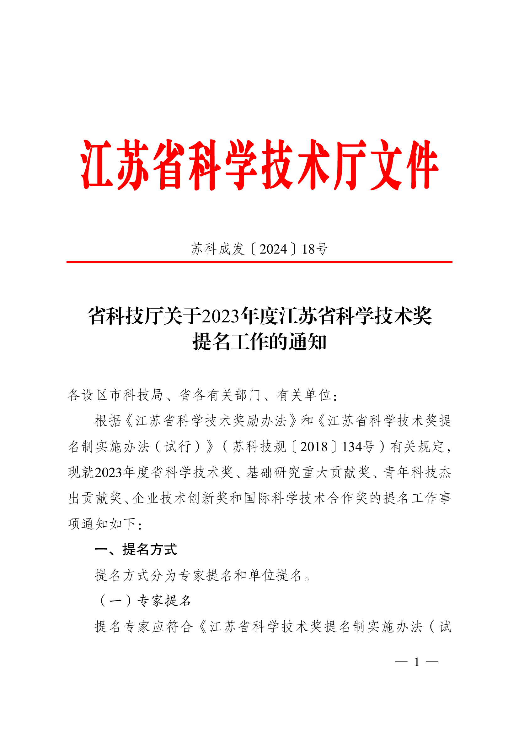 省科技厅关于2023年度江苏省科学技术奖提名工作的通知