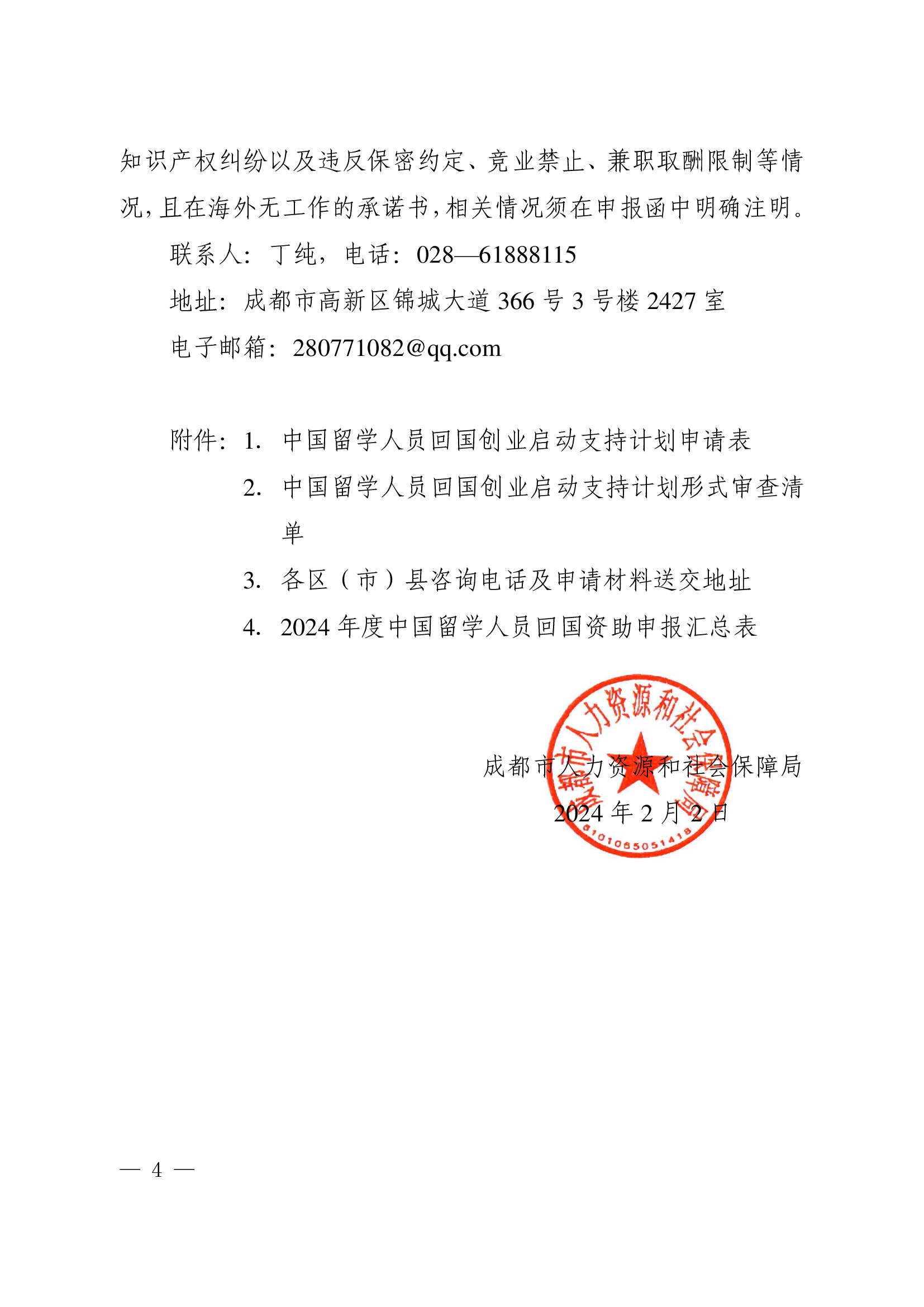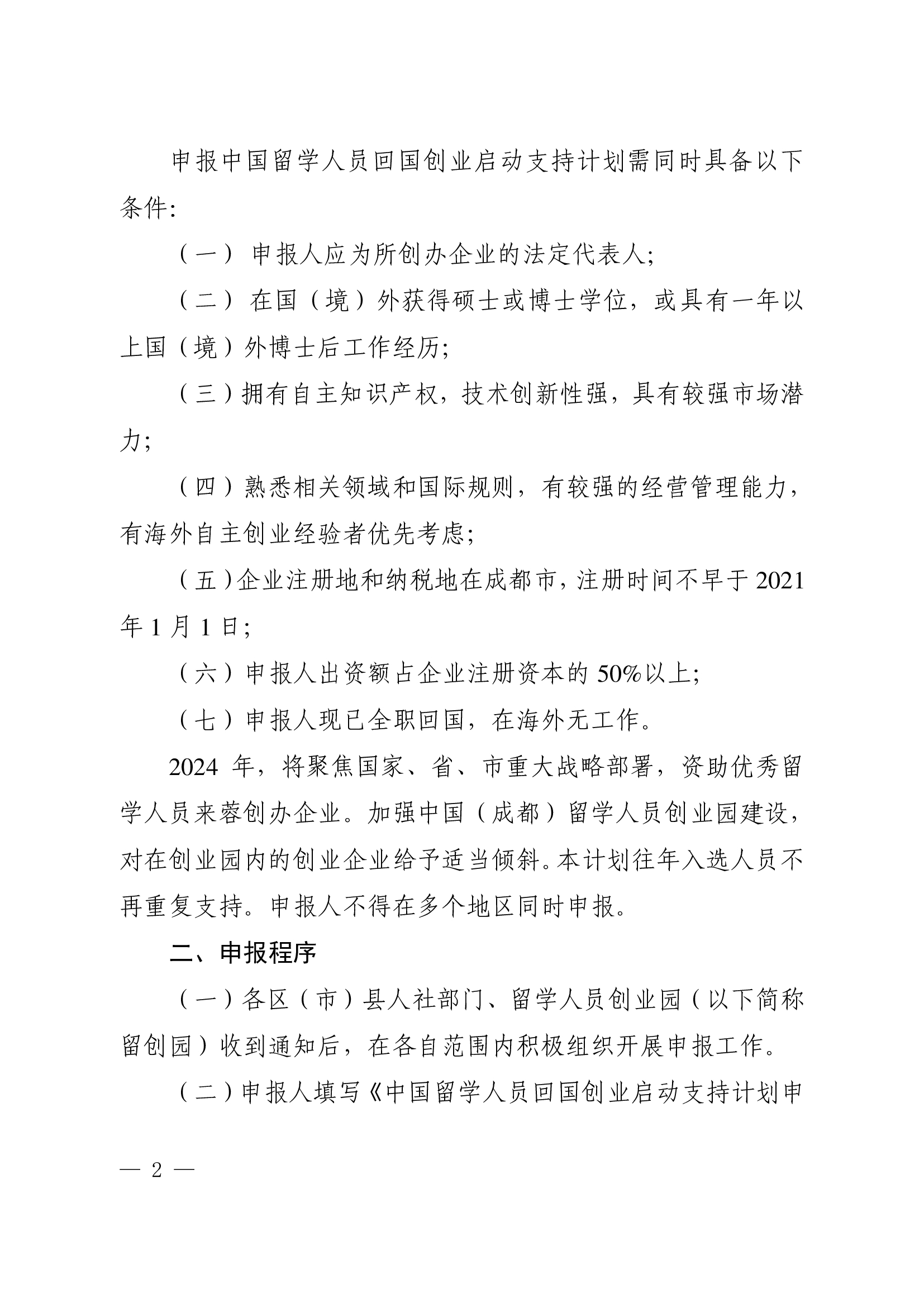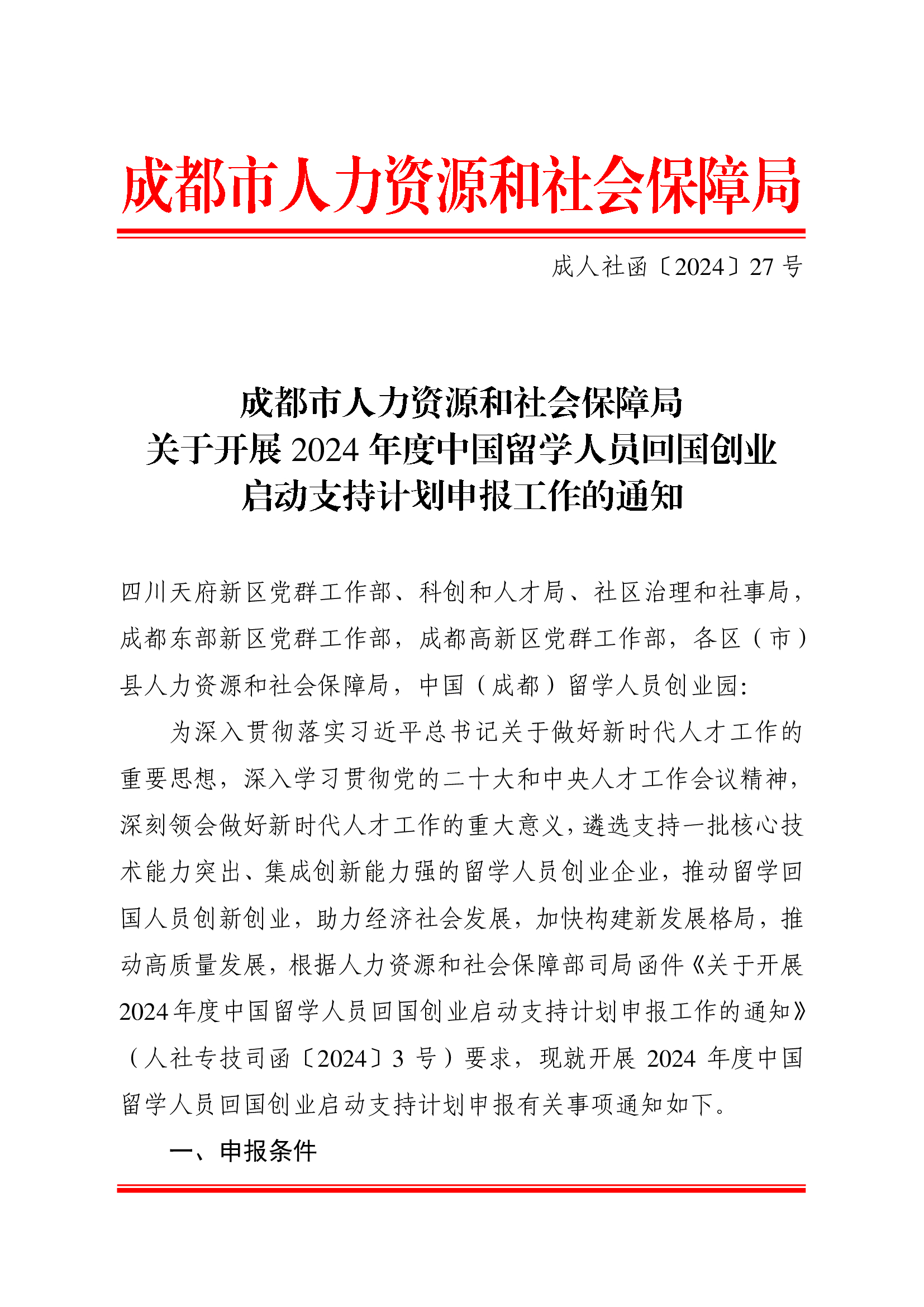成都市人力资源和社会保障局关于开展2024年度中国留学人员回国创业启动支持计划申报工作的通知