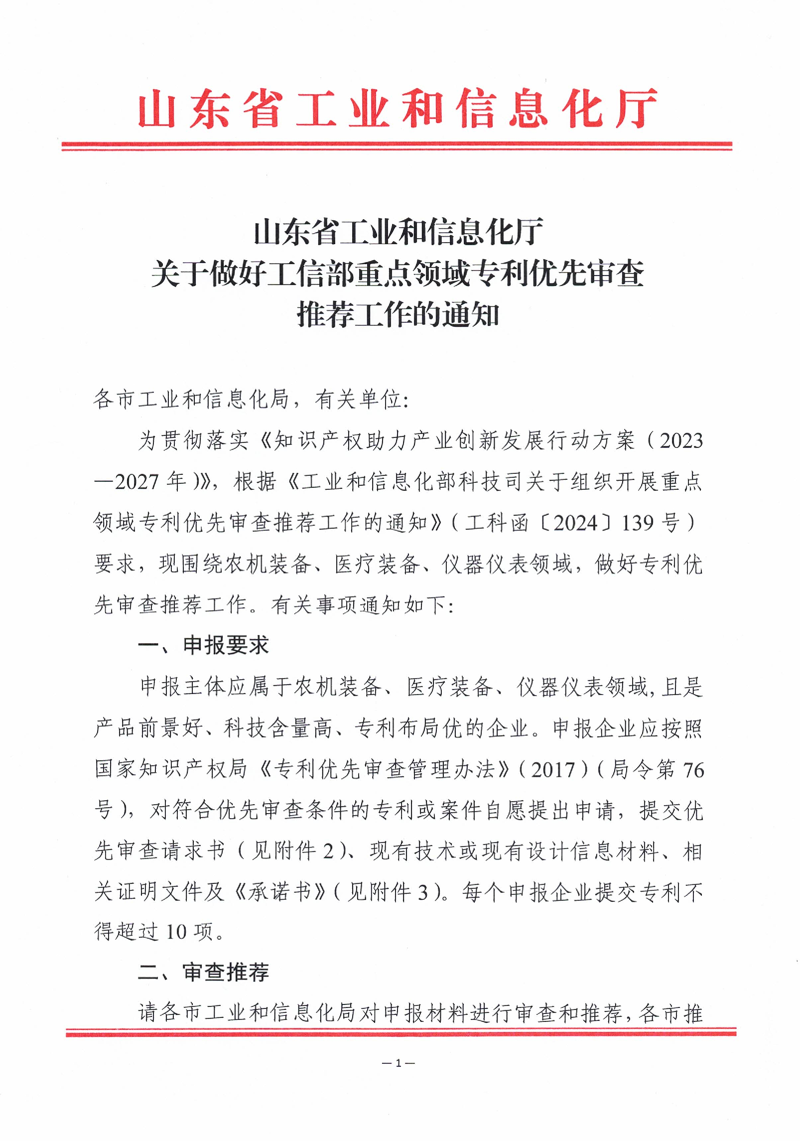 山东省工业和信息化厅关于做好工信部重点领域专利优先审查推荐工作的通知