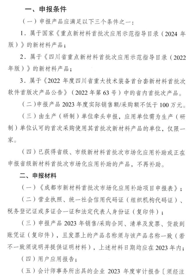 成都市开展2024年新材料首批次市场化应用补助项目申报工作