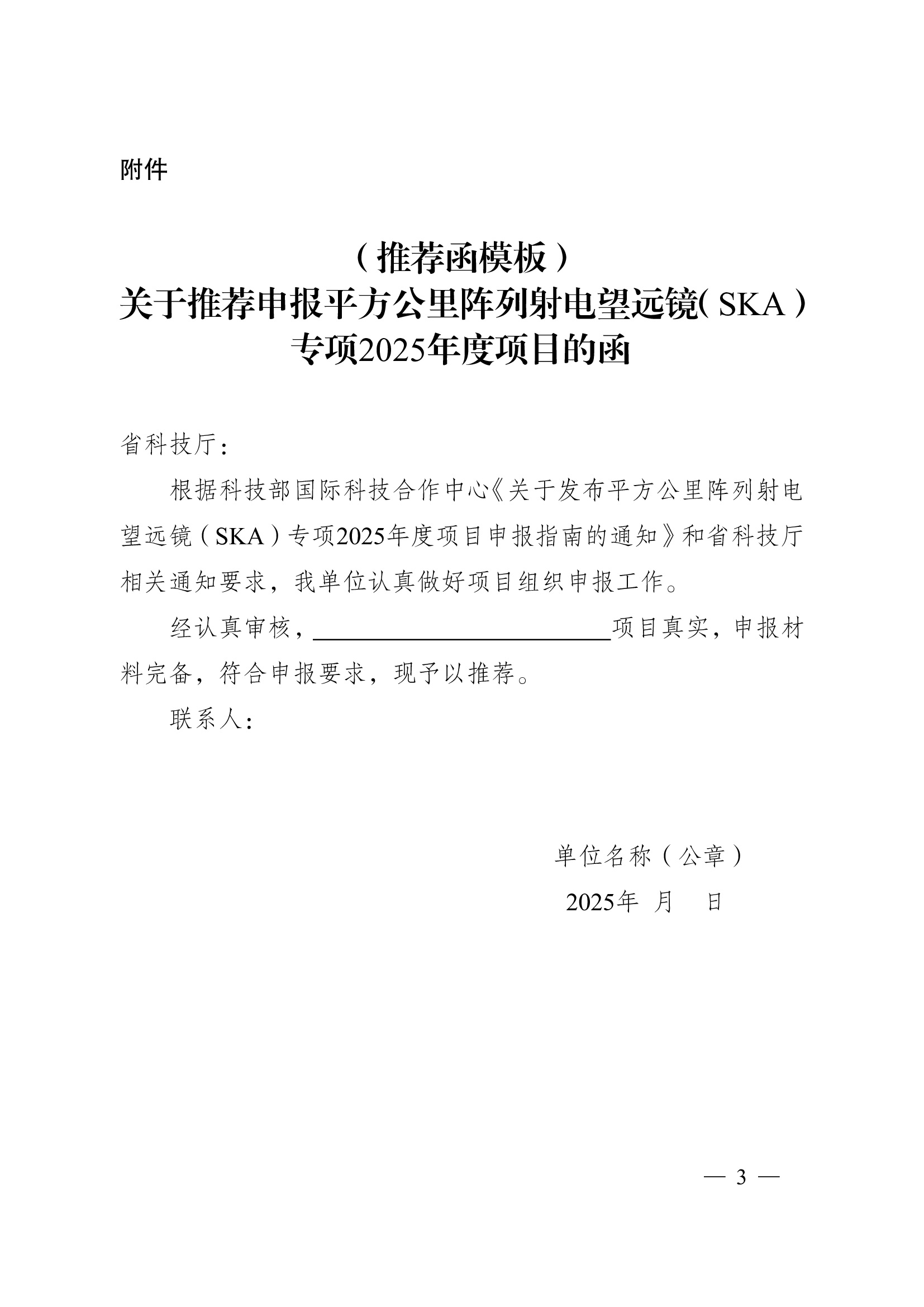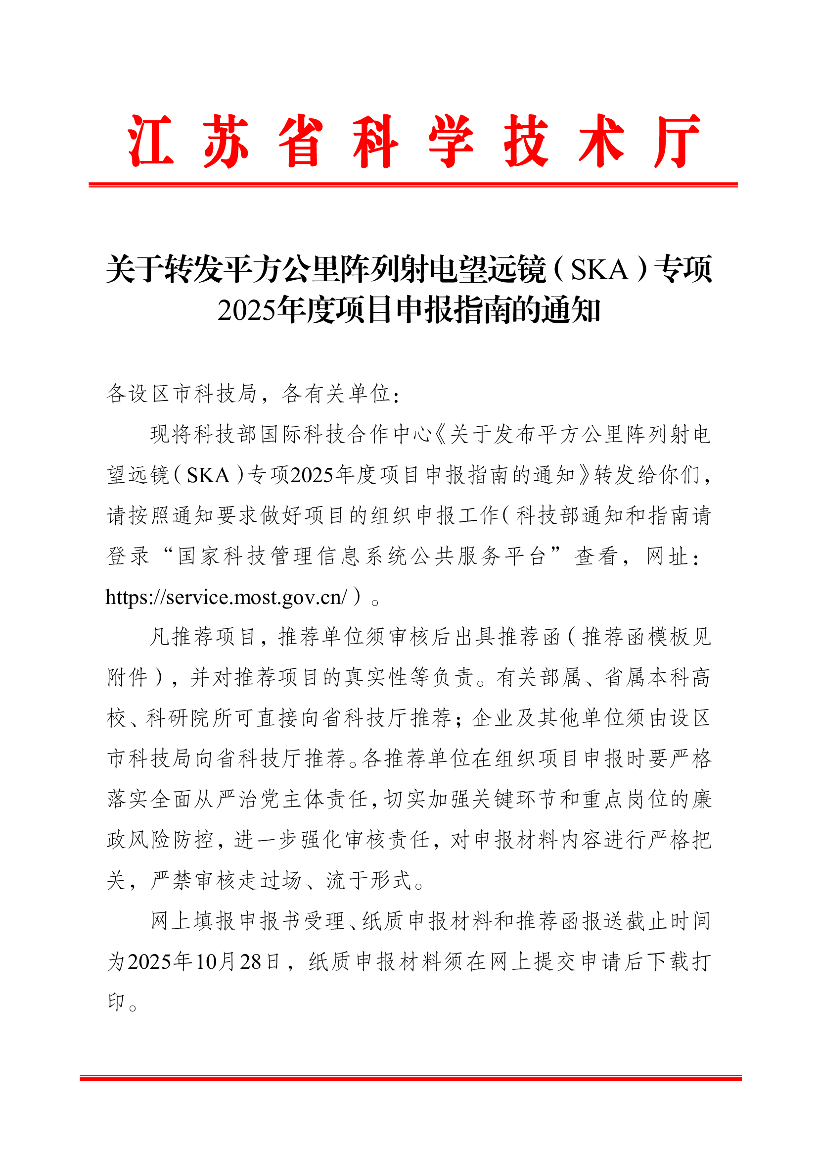 江苏省科学技术厅 关于转发平方公里阵列射电望远镜(SKA)专项2025年度项目申报指南的通知