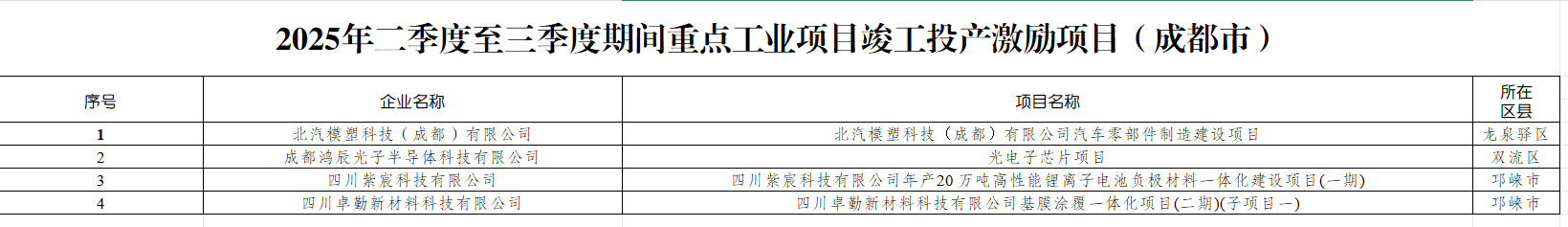 按照四川省经济和信息化厅《关于做好2025年二季度至三季度重点工业项目竣工投产激励工作的通知》(川经信办函〔2025〕156号)、成都市经济和信息化局《关于组织申报2025年二季度至三季度期间重点工业项目竣工投产激励项目的通知》要求,经企业申报、区(市)县推荐、专家核实等程序,现将四川省成都市2025年二季度至三季度期间重点工业项目竣工投产激励拟推荐对象进行公示(名单附后)。