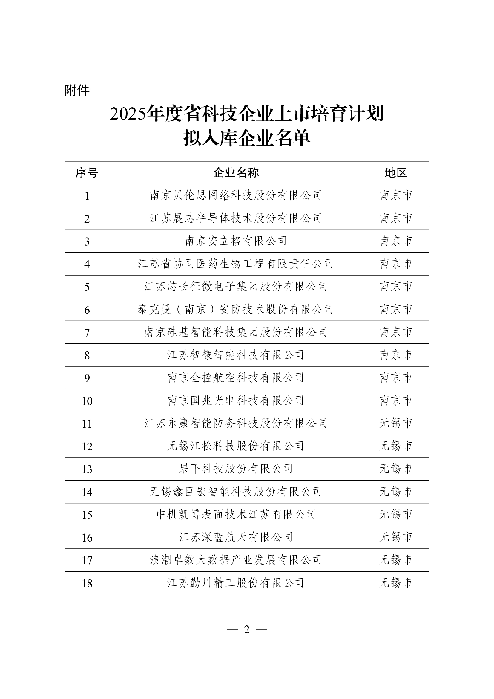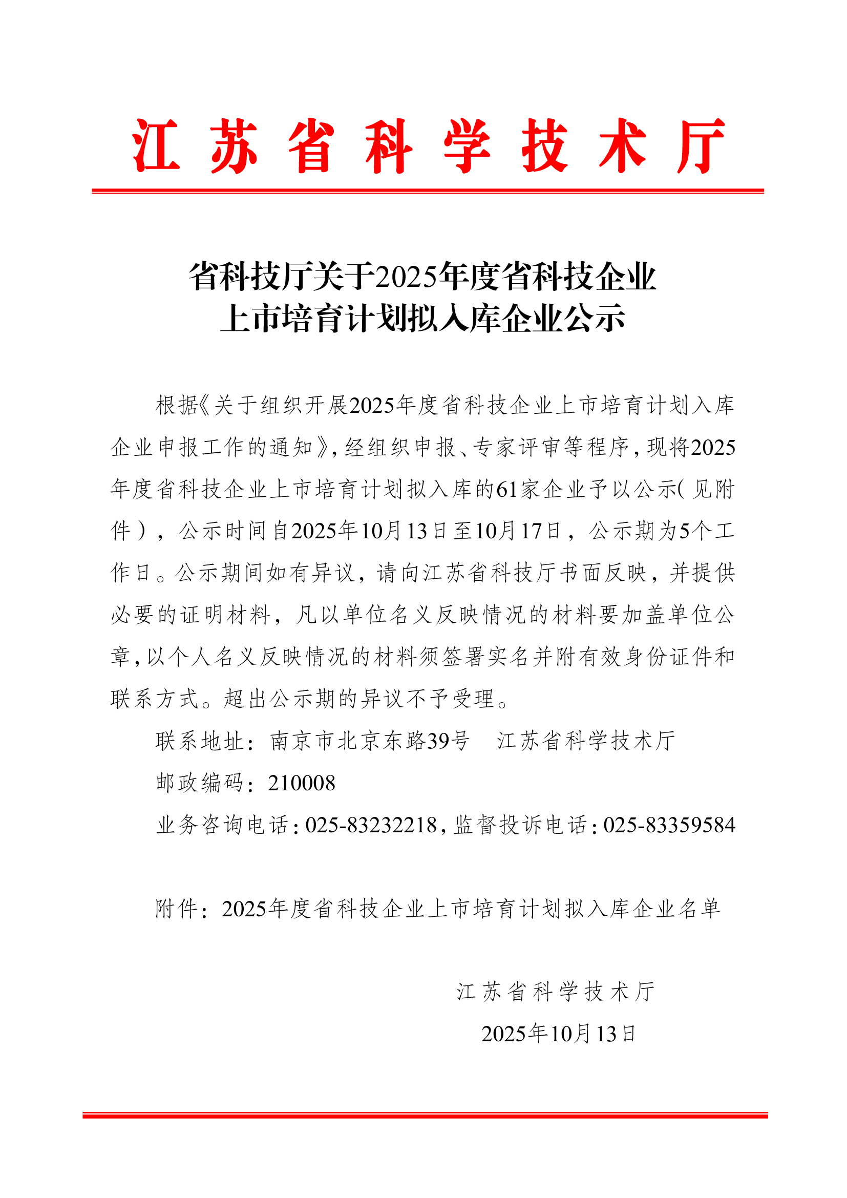 江苏省科技厅关于2025年度省科技企业上市培育计划拟入库企业公示