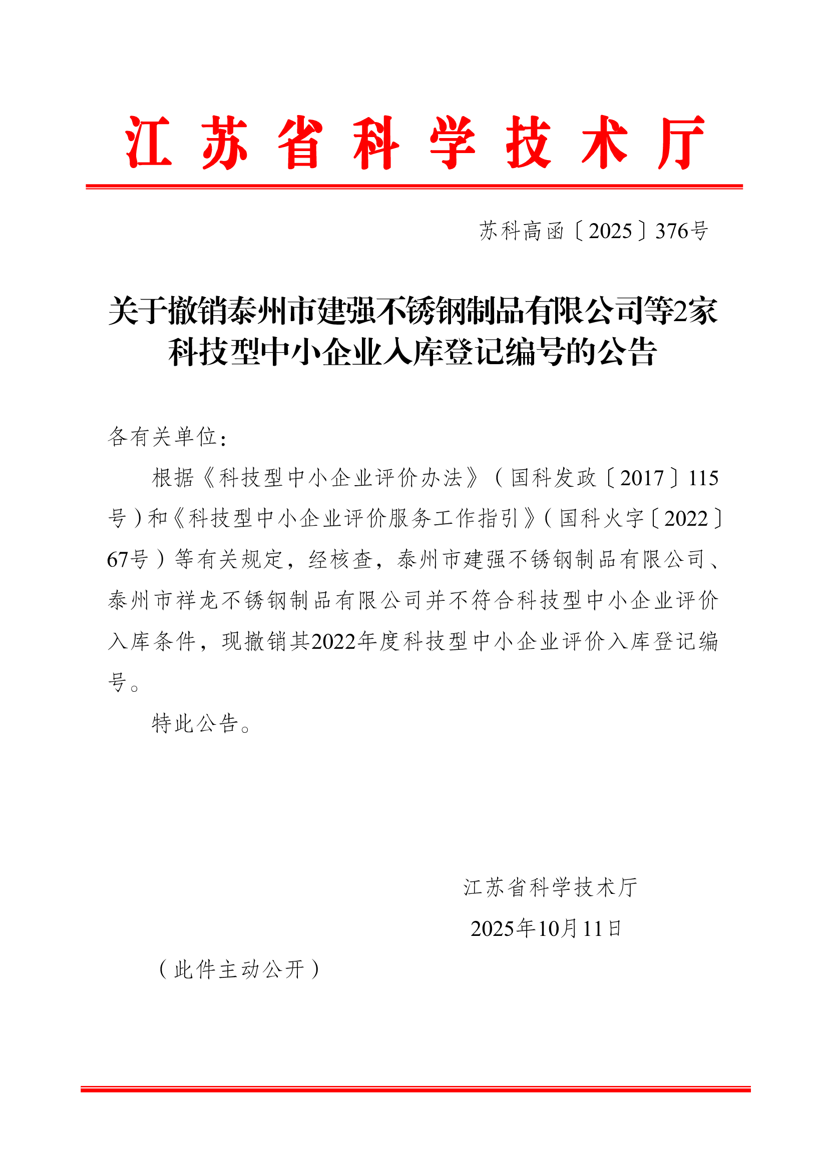 关于撤销泰州市建强不锈钢制品有限公司等2家科技型中小企业入库登记编号的公告