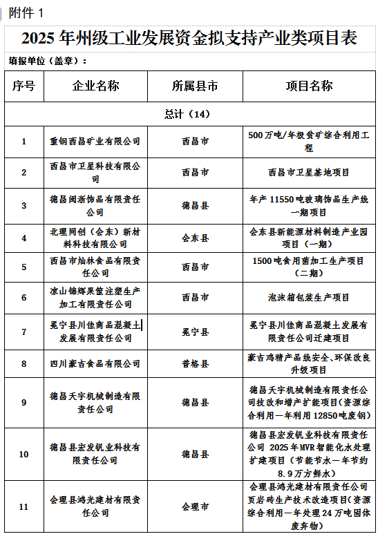 按照《凉山州经济和信息化局办公室关于组织开展2025年州级工业发展资金项目征集工作的通知》,经企业自主申报、县市初审推荐、专家评审通过、完成现场核实,现将拟纳入2025年州级工业发展资金支持的项目予以公示。公示时间为2025年10月14日至10月20日,干部群众和企业对公示项目如有异议,请向州经信局机关纪委或州纪委监委派驻州发改委纪检监察组反映。