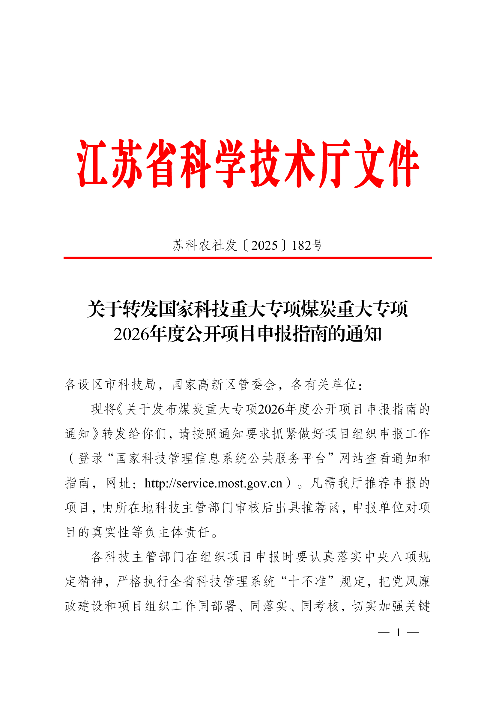 江苏省科学技术厅关于转发国家科技重大专项煤炭重大专项2026年度公开项目申报指南的通知