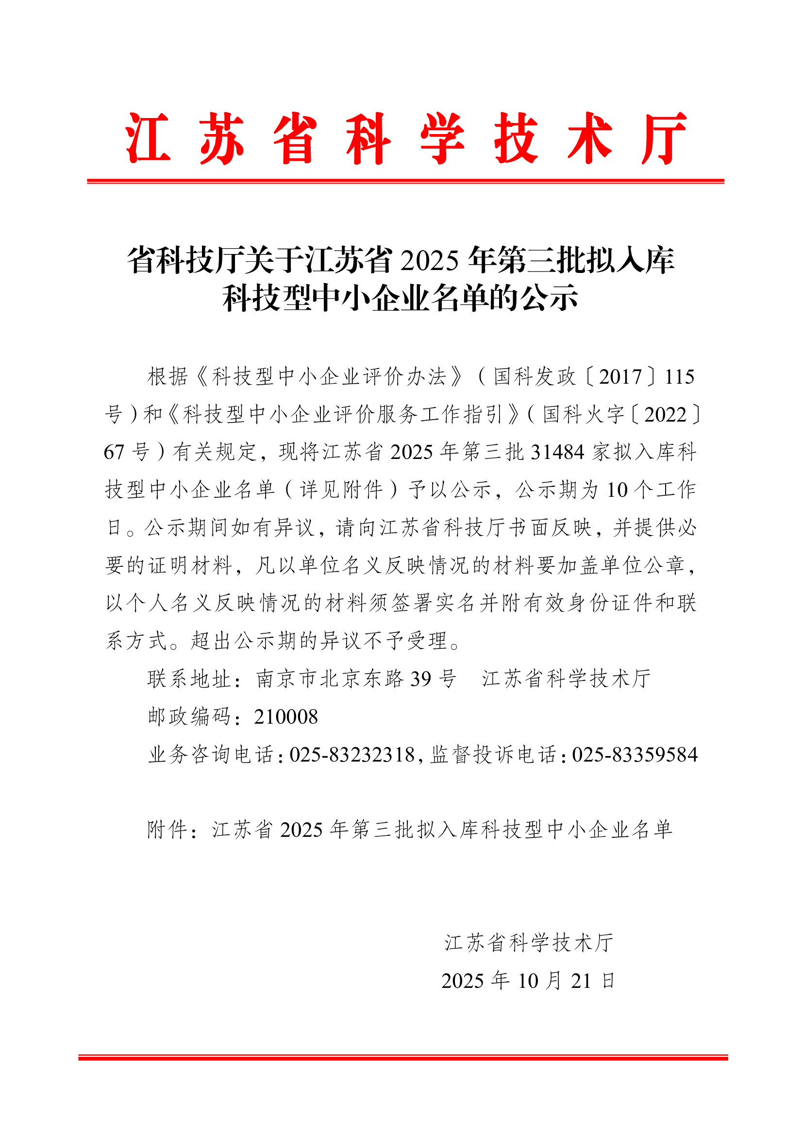 省科技厅关于江苏省2025年第三批拟入库科技型中小企业名单的公示