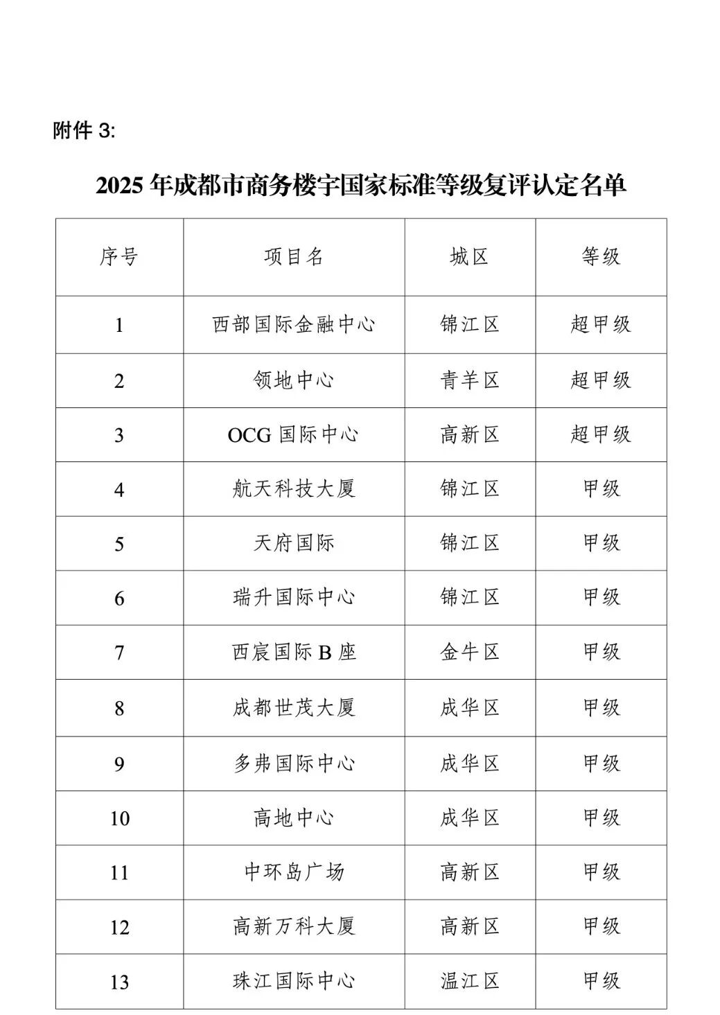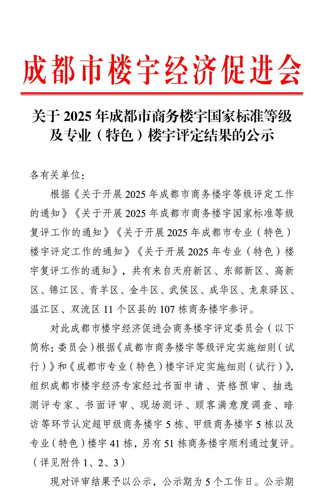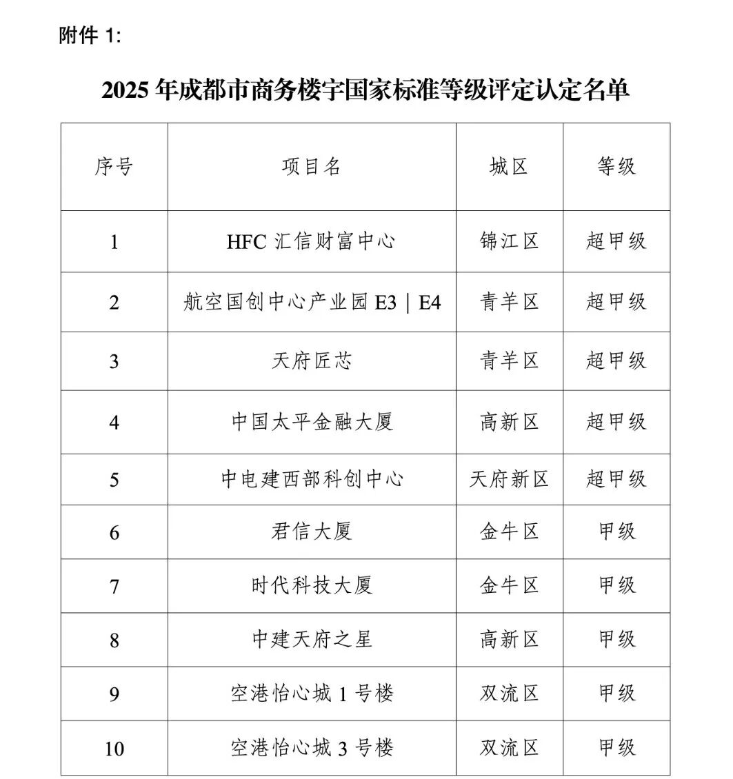 关于2025年成都市商务楼宇国家标准等级及专业(特色)楼宇评定结果的公示