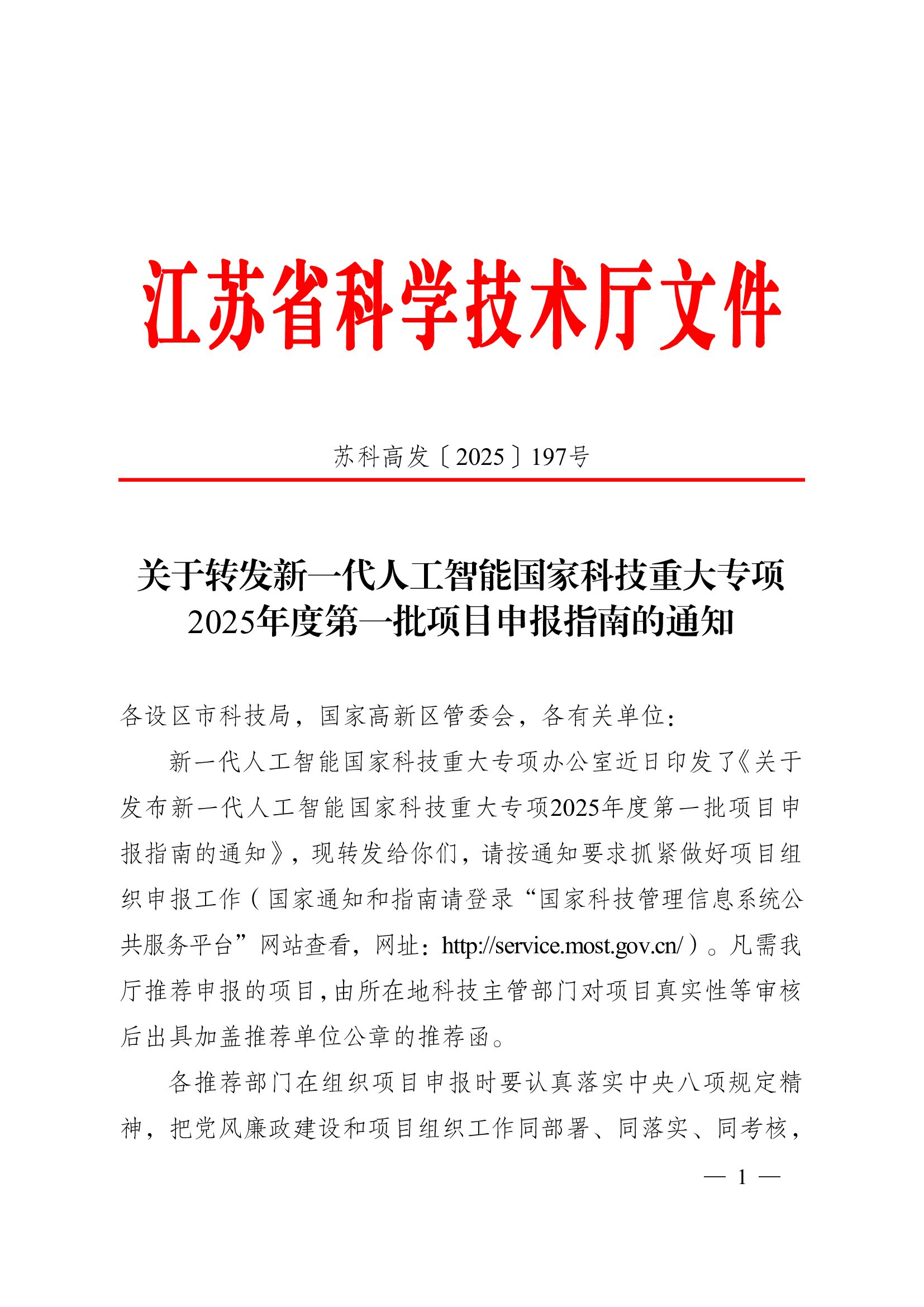 江苏省科学技术厅 关于转发新一代人工智能国家科技重大专项2025年度第一批项目申报指南的通知