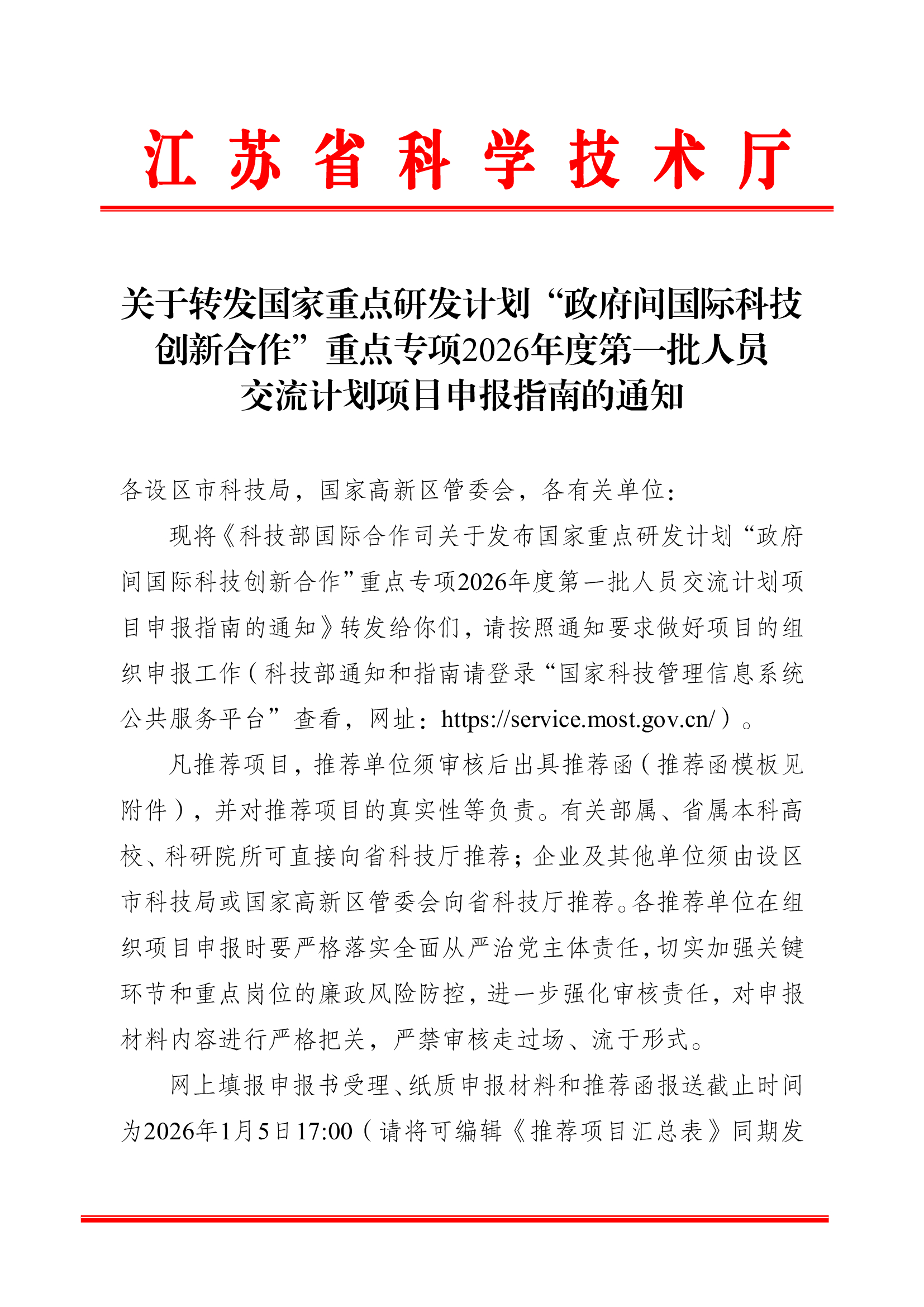 江苏省科学技术厅关于转发国家重点研发计划“政府间国际科技创新合作”重点专项2026年度第一批人员交流计划项目申报指南的通知