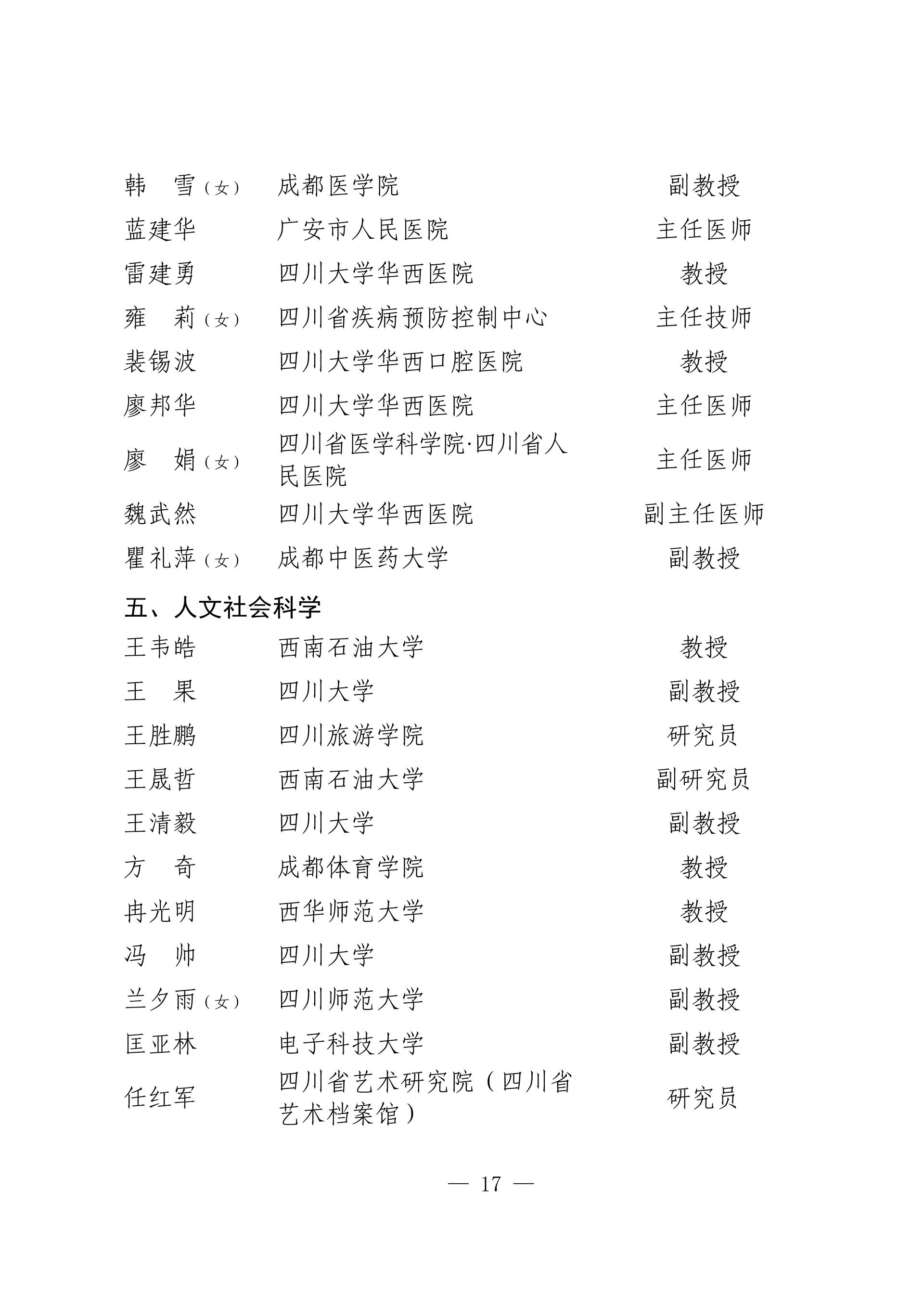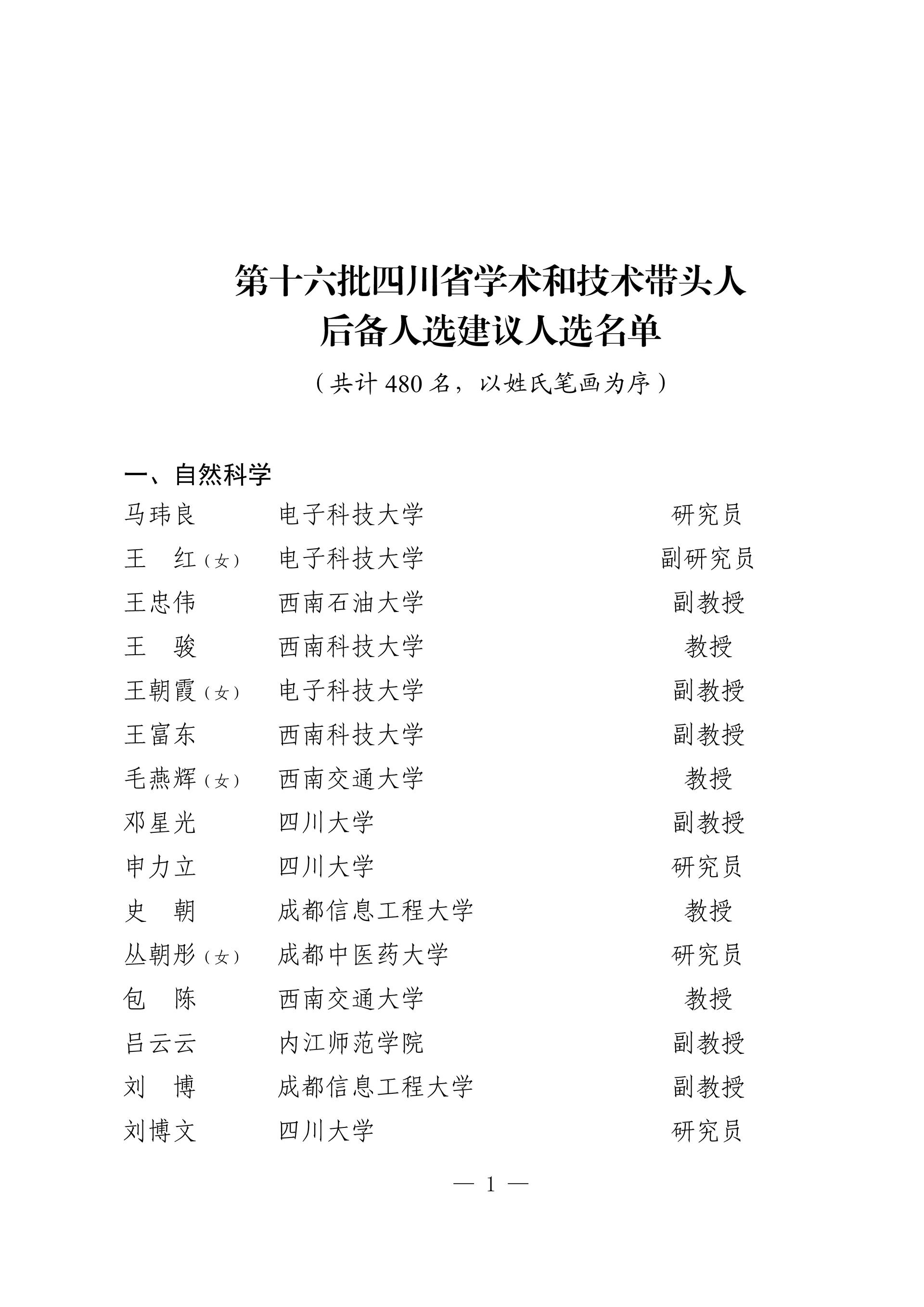 经专家评审委员会评审通过,马玮良等480名同志为第十六批四川省学术和技术带头人后备人选建议人选,现予公示,公示期为2025年12月17日至12月23日。