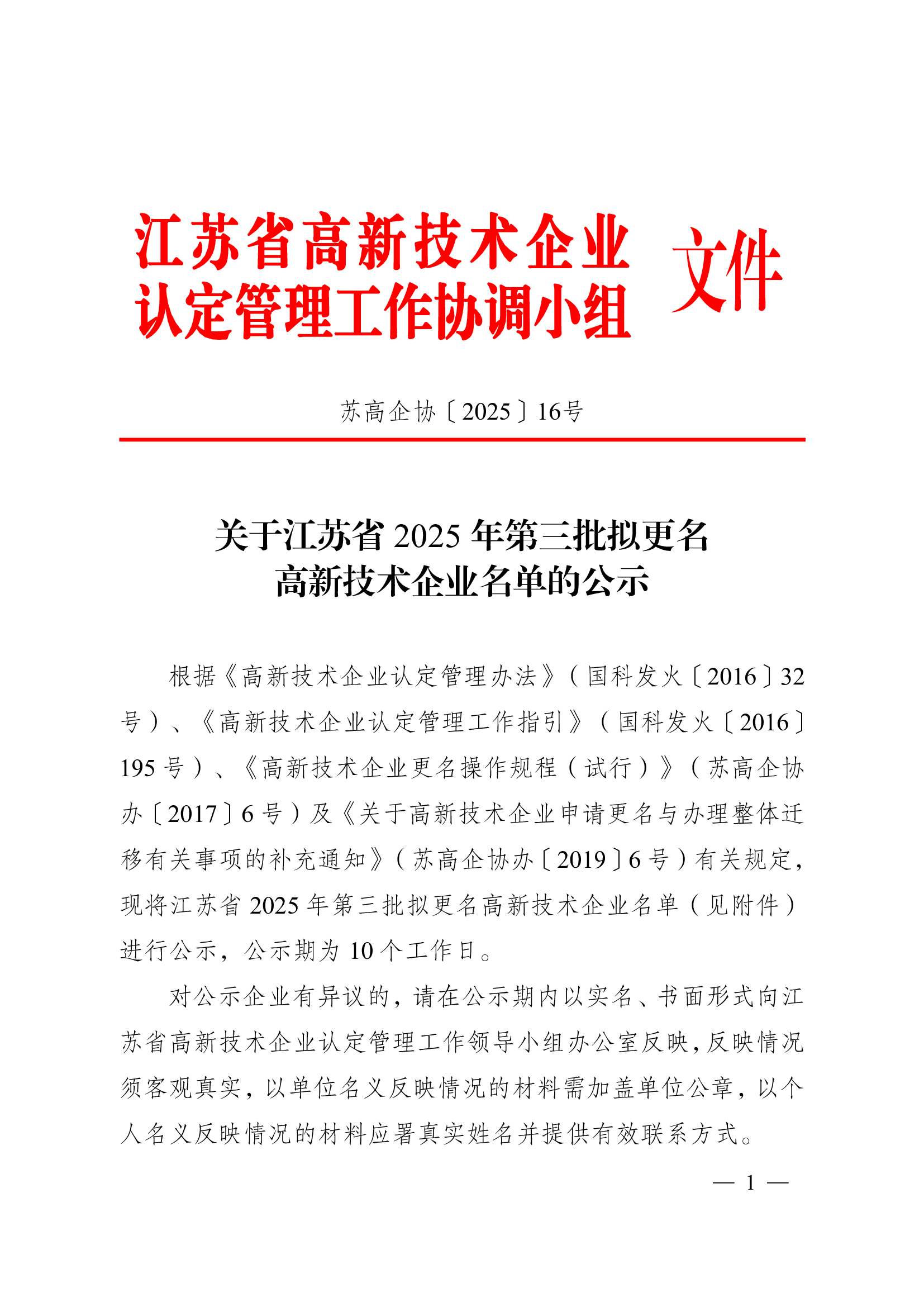 关于江苏省2025年第三批拟更名高新技术企业名单的公示