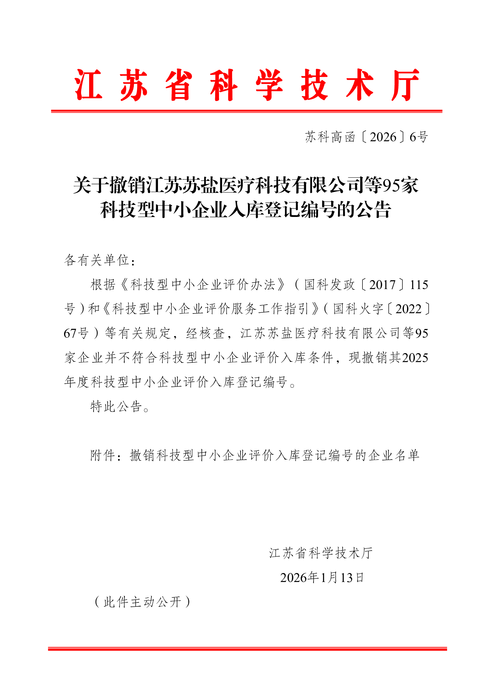 关于撤销江苏苏盐医疗科技有限公司等95家科技型中小企业入库登记编号的公告
