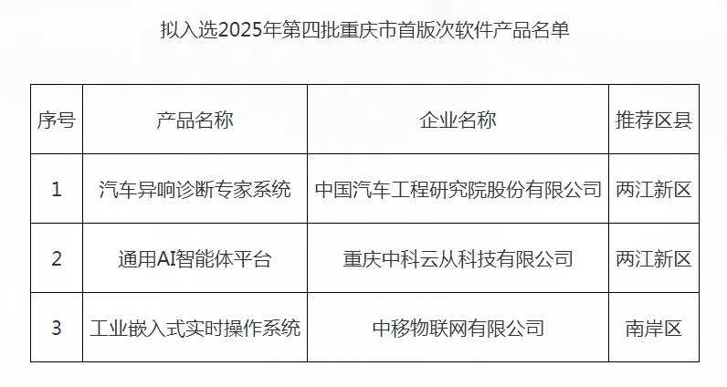 为进一步推进重庆市软件和信息服务业“满天星”行动计划,鼓励和引导我市软件产业强化重点领域突破,提升软件企业的自主创新和市场开拓能力,我委组织开展了2025年第四批重庆市首版次软件产品征集工作。经企业自主申报,各区县经信部门审核推荐及专家评审,拟将“汽车异响诊断专家系统”等3个软件产品入选2025年第四批重庆市首版次软件产品名单,现将名单予以公示。