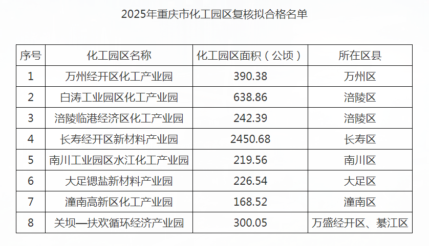 按照《化工园区建设标准和认定管理办法(试行)》(工信部联原〔2021〕220号)、《关于推进化工园区规范建设和高质量发展有关工作的通知》(工信厅联原函〔2025〕317号)、《关于反馈省级化工园区认定管理实施细则复核意见的函》(工原函〔2025〕351号)和《重庆市化工园区建设标准和认定管理办法(2025年)》(渝经信发〔2025〕86号)要求,我委会同市发展改革委、市规划自然资源局、市生态环境局、市交通运输局、市水利局、市应急管理局及相关领域专家开展了全市化工园区复核工作,现将复核拟合格化工园区名单予以公示。