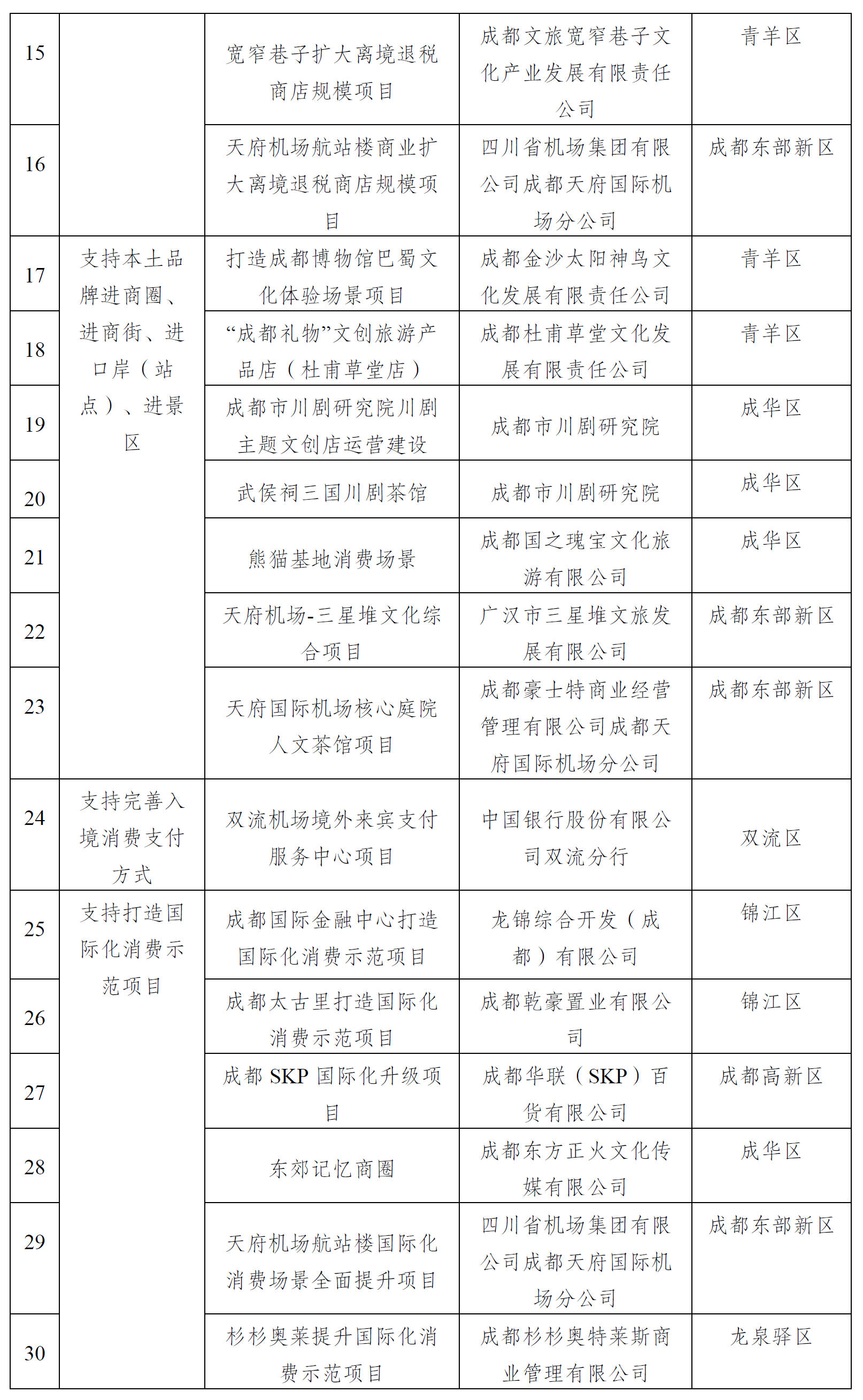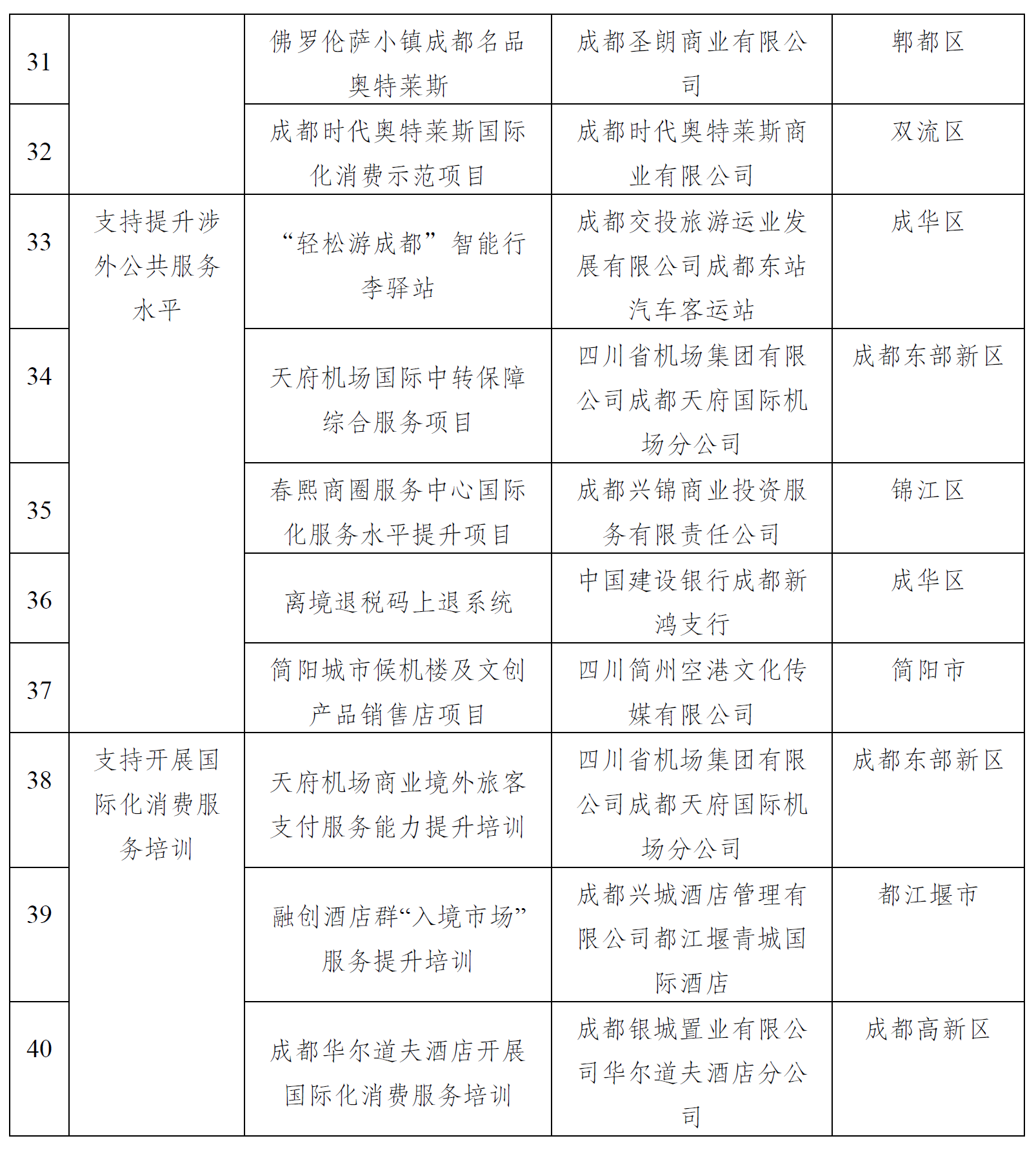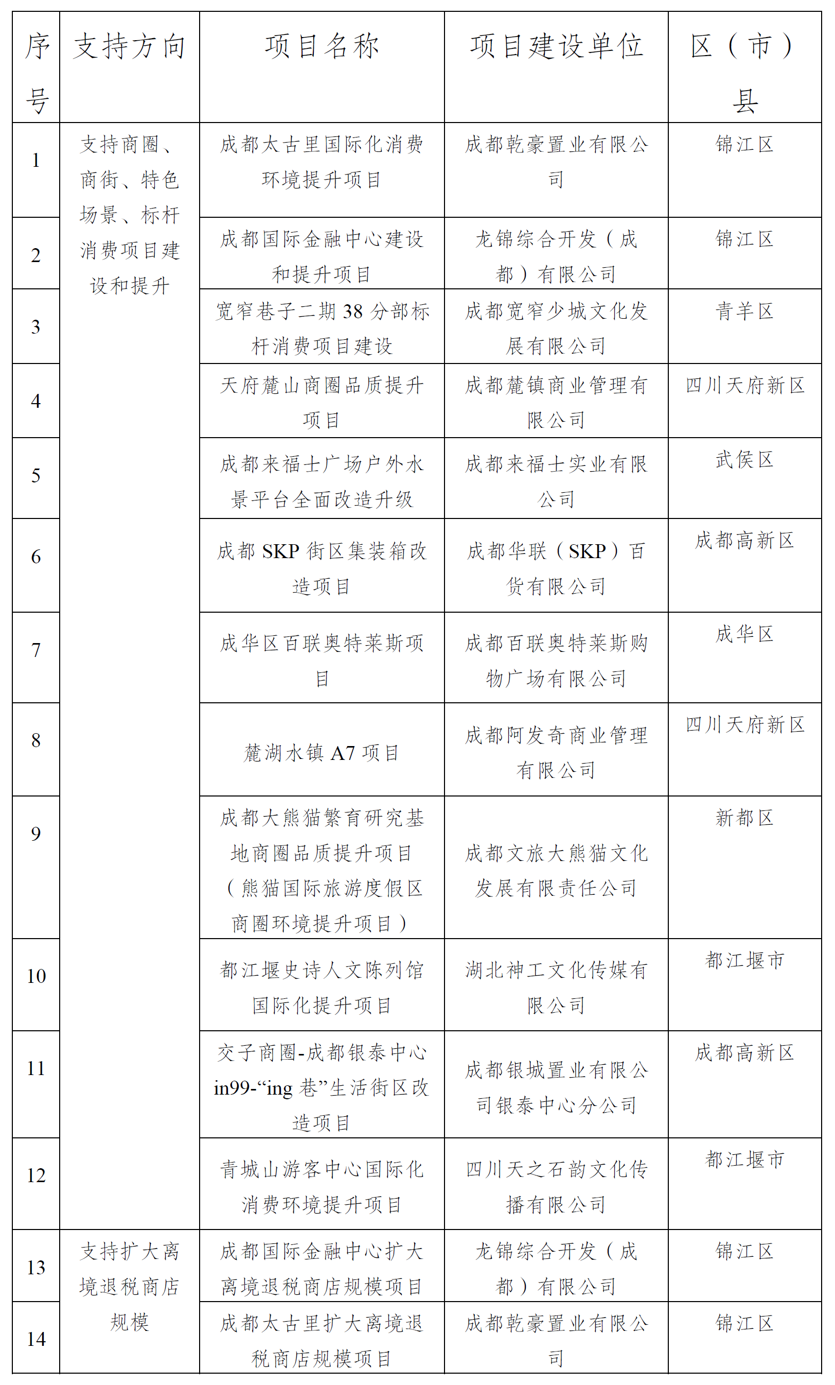 成都市国际化消费环境建设试点拟支持项目名单