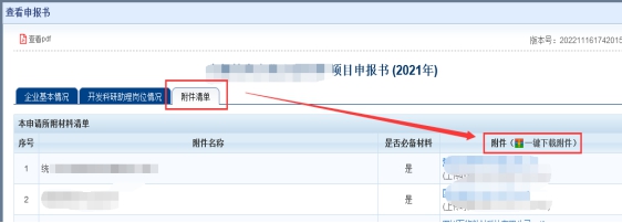 2.下载附件。项目负责人使用本人账号登录“成都市科技项目管理系统”,点击拟提交材料项目的“项目名称”(如图1所示),再点击“附件清单”-“一键下载附件”(如图3所示),完成附件下载(提示:附件只需下载,无需重新制作和准备)。