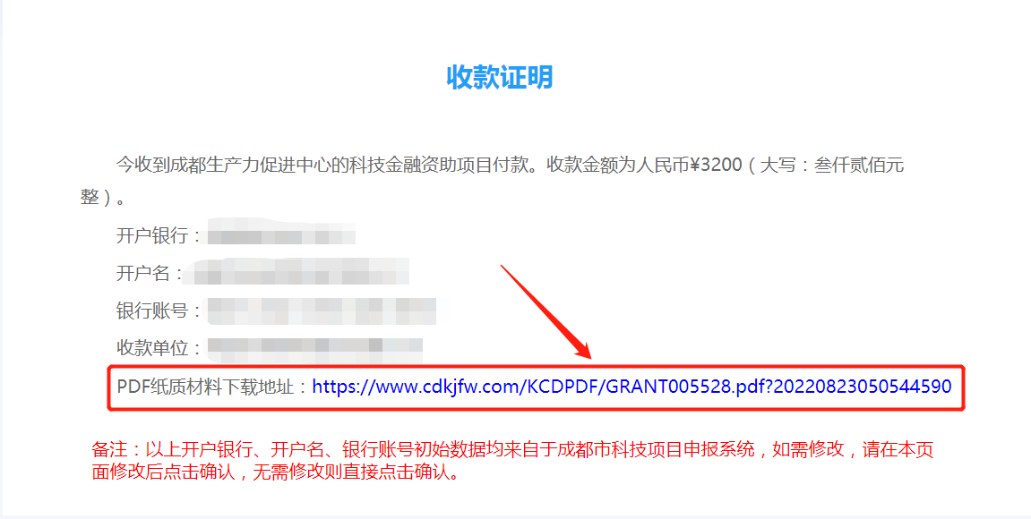 项目负责人点击确认“确认收款证明”链接,核实《收款证明》中本单位的“开户银行”“开户名”“银行账号”“收款单位”等信息无误后点击“确认”(如图1所示),再点击“PDF纸质材料下载地址”(如图2所示),形成带水印的电子版《收款证明》(如图3所示),下载打印《收款证明》后加盖单位公章及财务章。