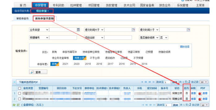 项目负责人可通过管理系统在线查询确认纸件材料办理结果:市政务服务中心科技局窗口未确认收到纸件材料前,对应项目申报书在管理系统中“是否接收纸质”状态为“否”(如图9所示);市政务服务中心科技局窗口收到纸件材料后,在管理系统确认收件,管理系统自动将对应项目“是否接收纸质”状态修改为“是”(如图10所示)。