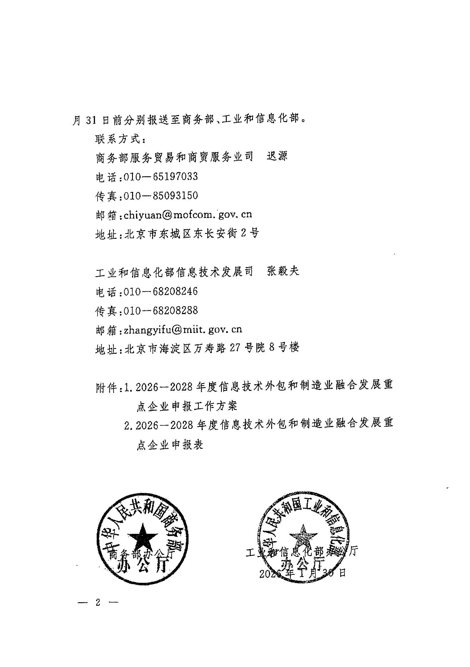 商务部办公厅 工业和信息化部关于组织申报2026-2028年度信息技术外包和制造业融合发展重点企业申