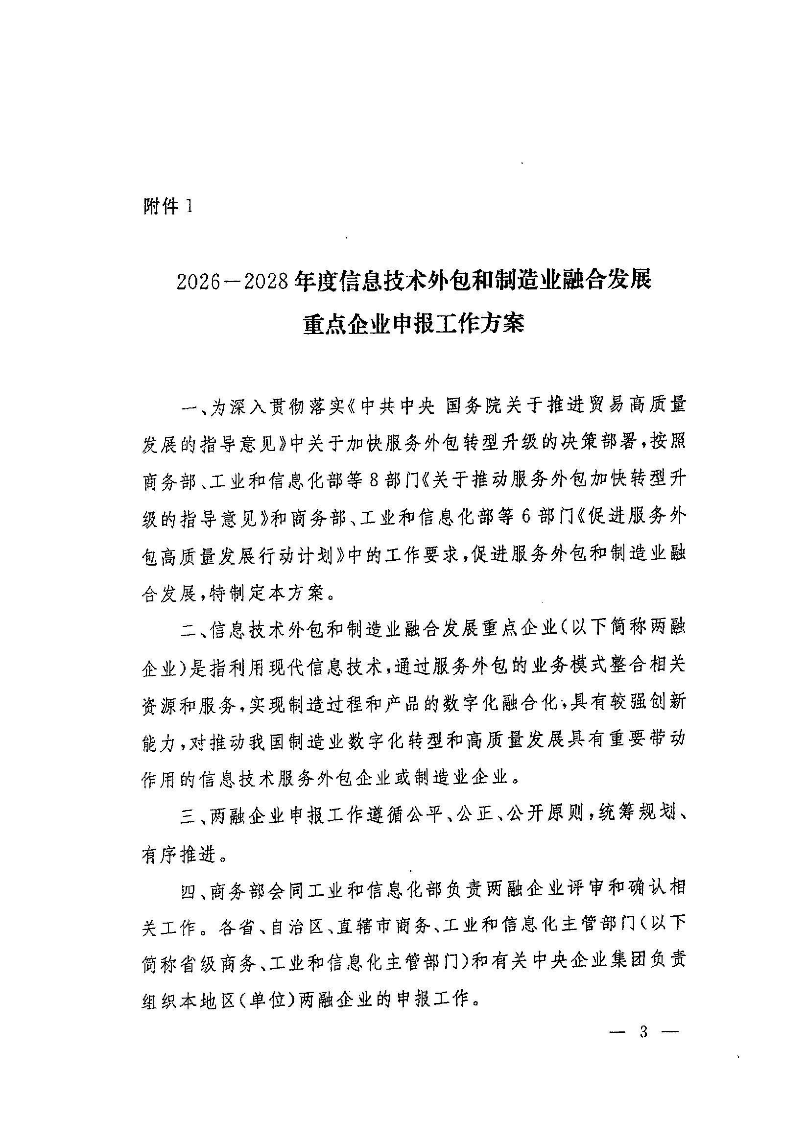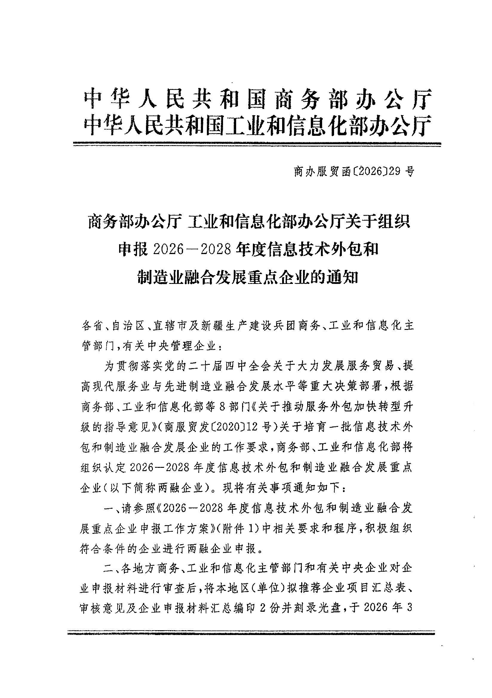 商务部办公厅工业和信息化部关于组织申报2026-2028年度信息技术外包和制造业融合发展重点企业申报工作通知