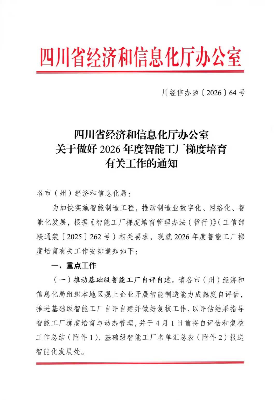 四川省经济和信息化厅办公室关于做好2026年度智能工厂梯度培育有关工作的通知》的通知