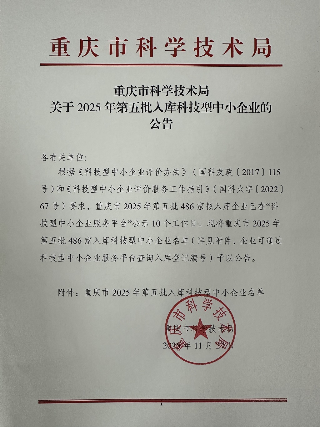 重庆市2025年第5批入库科技型中小企业名单公告