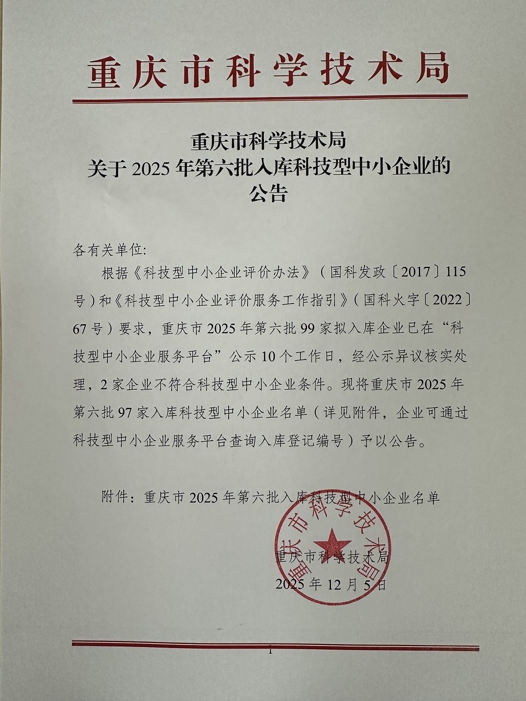 重庆市2025年第6批入库科技型中小企业名单公告