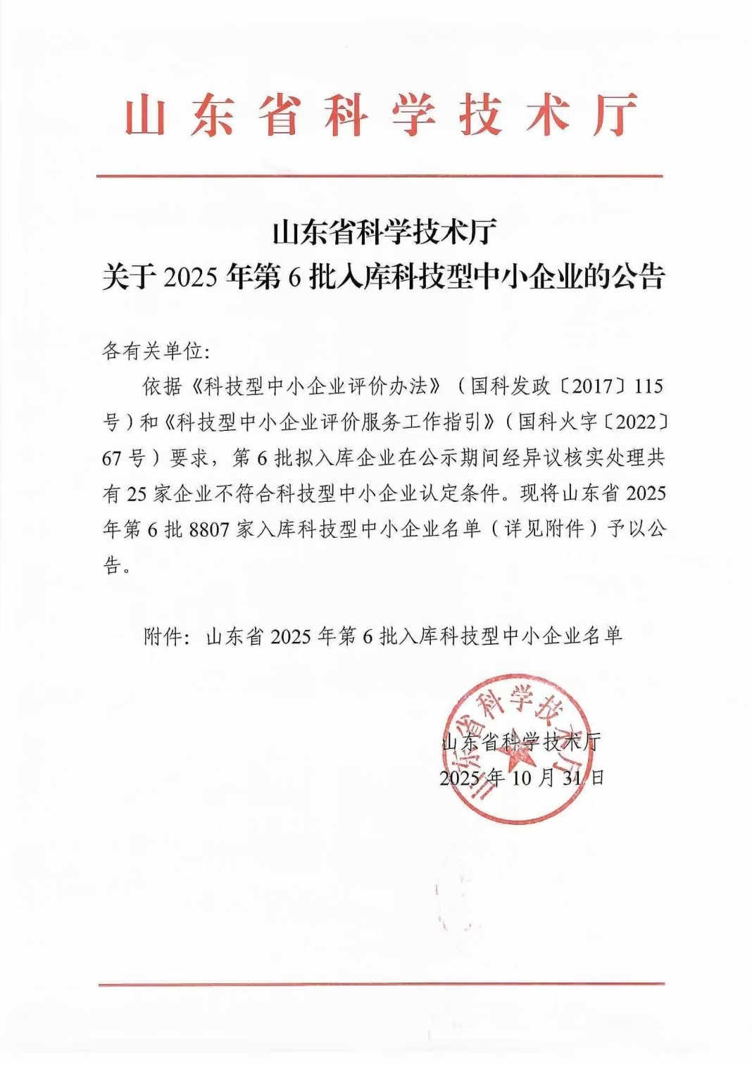 山东省2025年第6批入库科技型中小企业名单公告