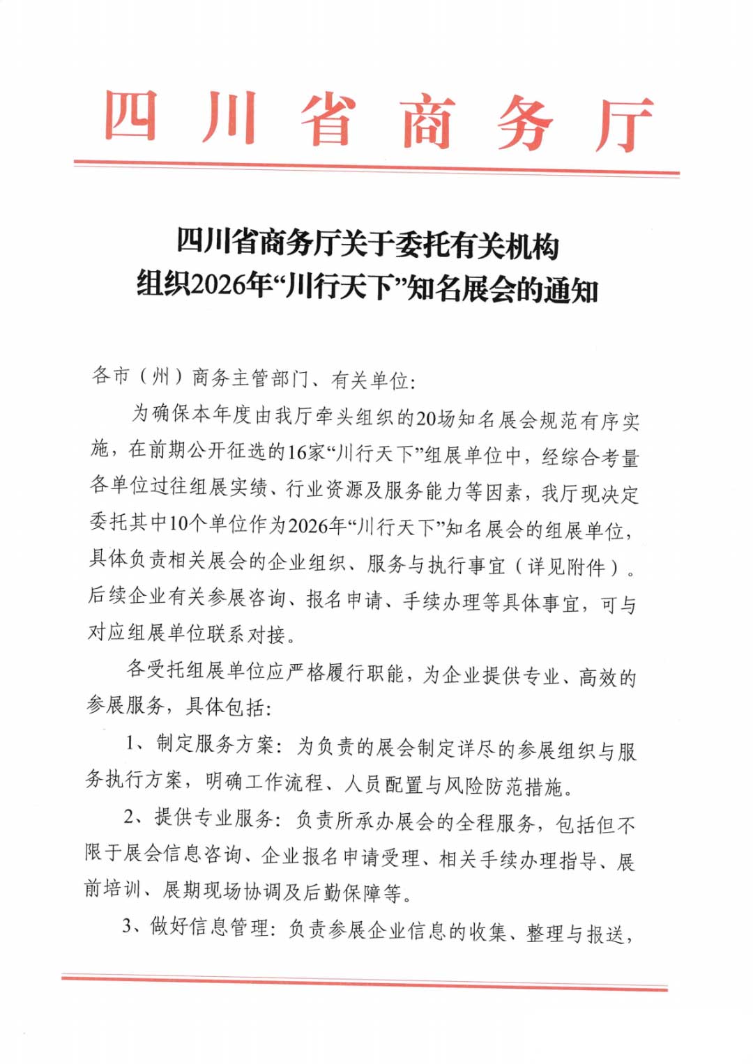 四川省商务厅关于委托有关机构组织2026年“川行天下”知名展会的通知