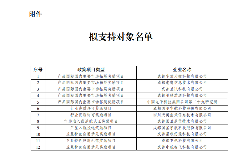 为贯彻落实《成都市促进卫星互联网与卫星应用产业发展专项政策》(成经信财〔2024〕3号),按照《成都市促进卫星互联网与卫星应用产业发展专项政策实施细则》(成经信财〔2024〕60号)等有关规定,经企业申报、区(市)县推荐、专家评审、征求意见、专项审计等程序,现将2025年成都市促进卫星互联网与卫星应用产业发展专项政策项目拟支持对象进行公示(名单附后)。