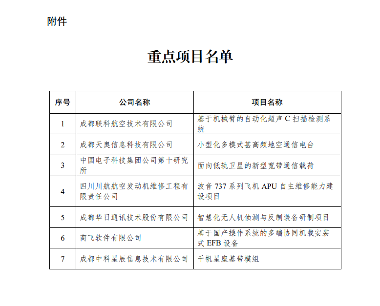 根据《四川省经济和信息化厅办公室关于做好2025年国家先进制造业集群重点项目相关工作的通知》(川经信办函〔2025〕393号)的相关要求,按照成都市经济和信息化局《关于组织申报2025年国家先进制造业集群重点项目的通知》等有关规定,经企业申报、区(市)县推荐、专家评审、征求意见、专项审计等程序,现将2025年国家先进制造业集群(成德绵自凉航空航天集群)重点项目进行公示(名单附后)。