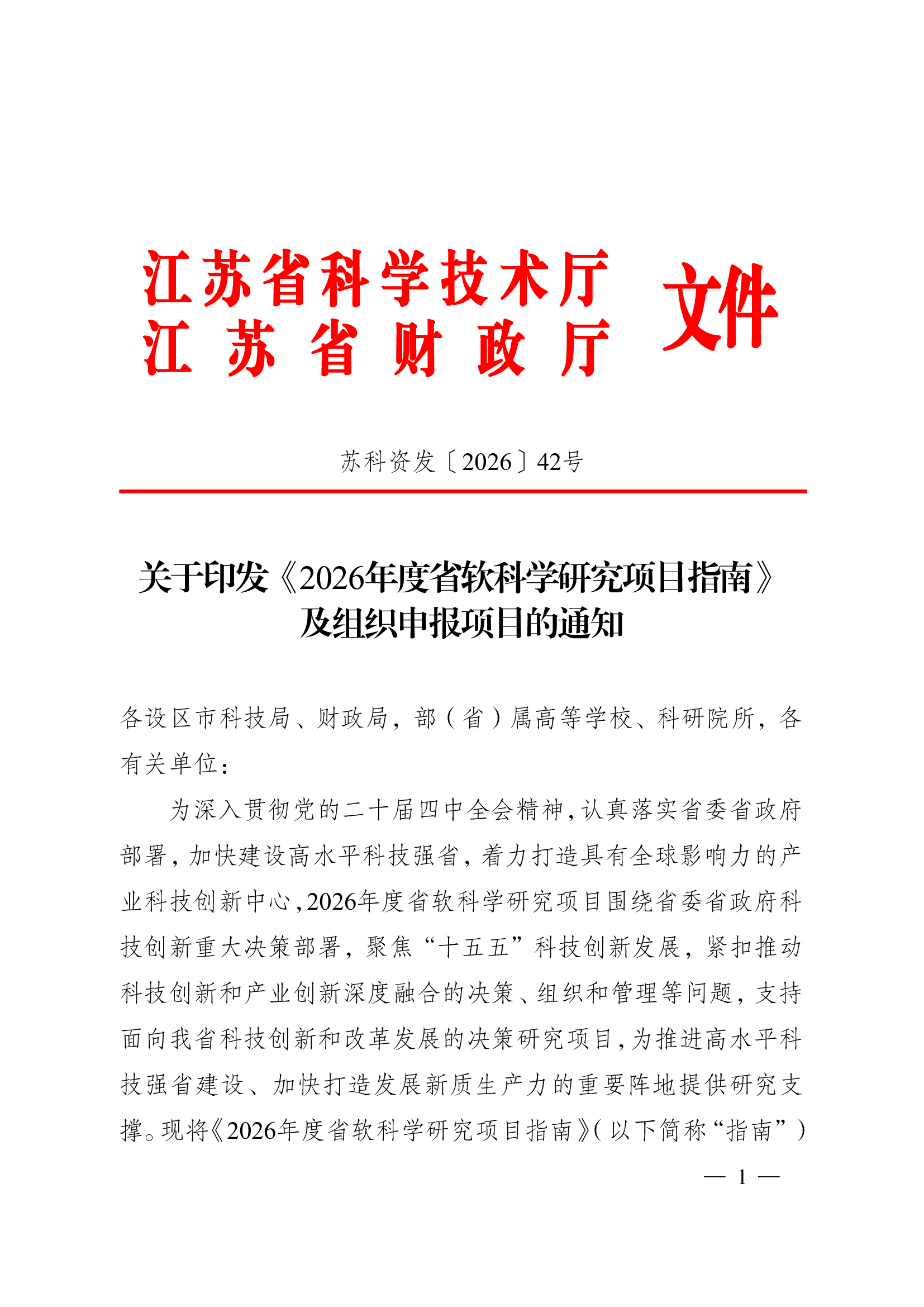 江苏省科学技术厅 关于印发《2026年度省软科学研究项目指南》及组织申报项目的通知