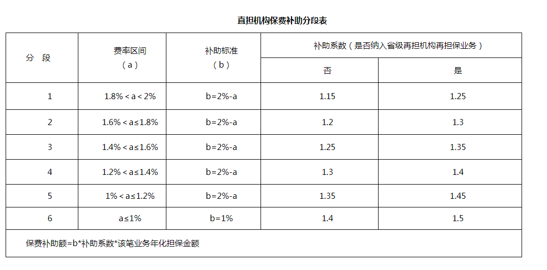 1.直担机构保费补助。对融资担保机构年化担保费率低于2%的小微、“三农”企业融资担保业务,结合与省级再担机构合作情况,分段确定费率区间和补助标准给予递增补助,最高不超过担保金额的1.5%。